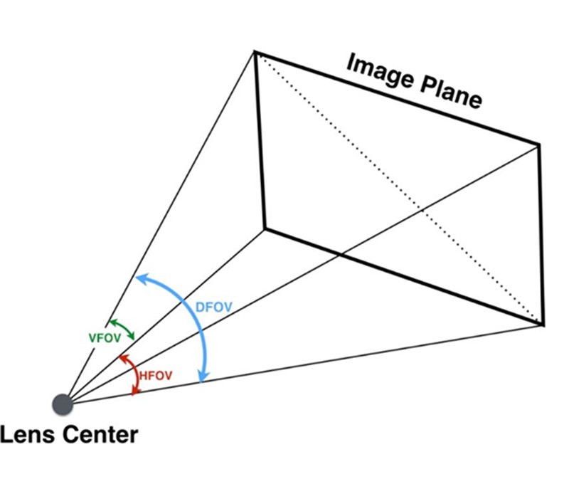 From the figure below, we can see that HFOV is determined by the focal length and the width of the sensor, VFOV is determined by the focal length and the height of the sensor, and DFOV is determined by the focal length, the width and the height of the sensor.