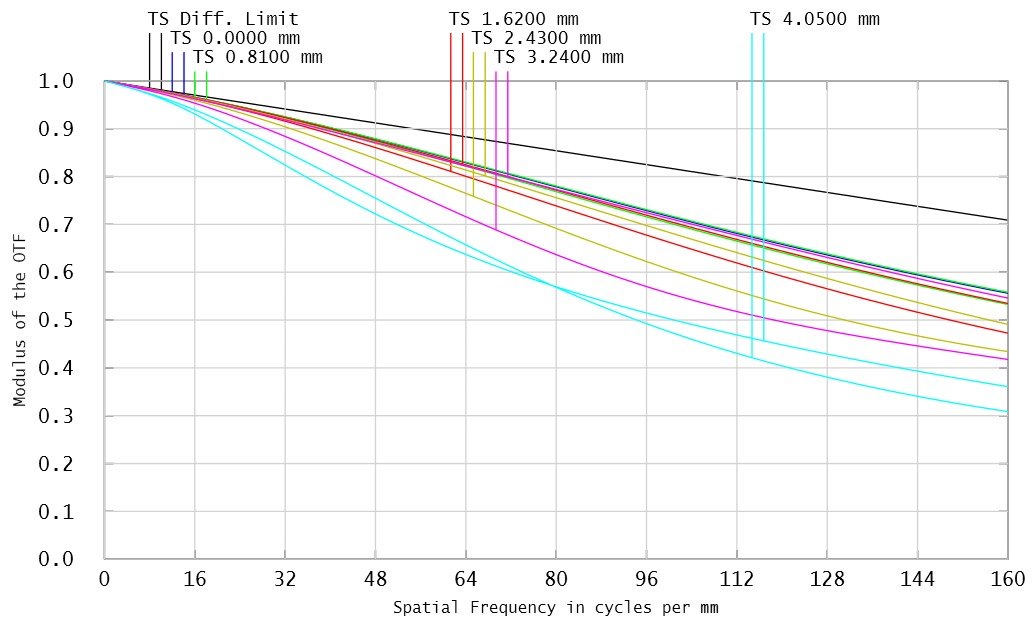 The horizontal coordinate in the figure represents the spatial frequency, the vertical coordinate represents the contrast, and the lines of different colors represent different field-of-view positions. There are two lines for each color: T-curve and S-curve, representing the meridian image and the sagittal image. The following conclusions can be obtained: